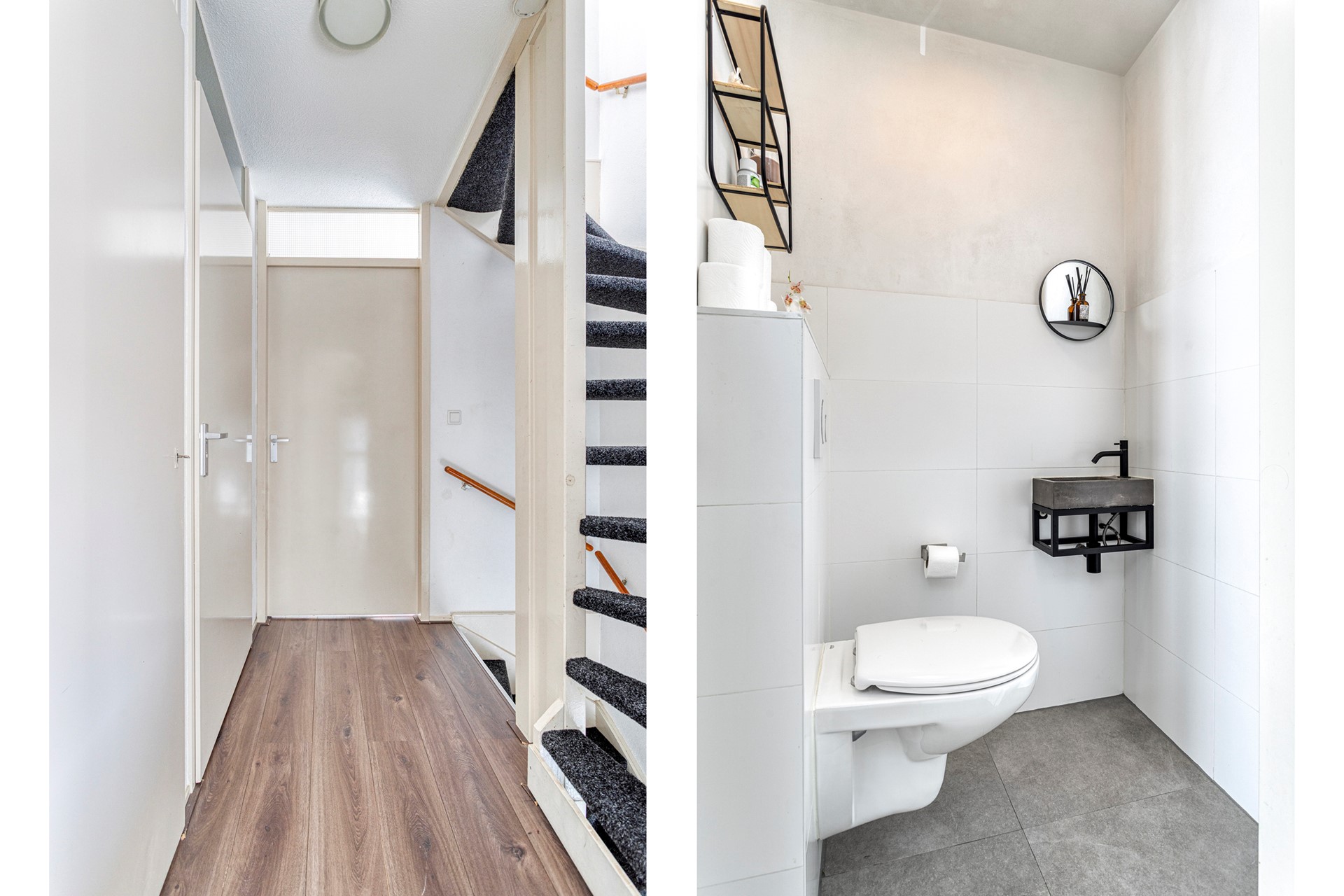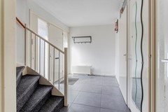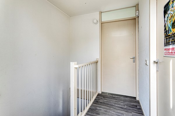 Eerste verdieping: vanaf de overloop zijn de woonkamer, cv-ruimte en de toiletruimte met fonteintje te bereiken.