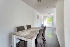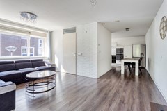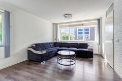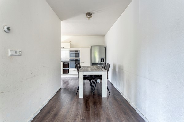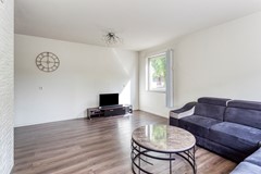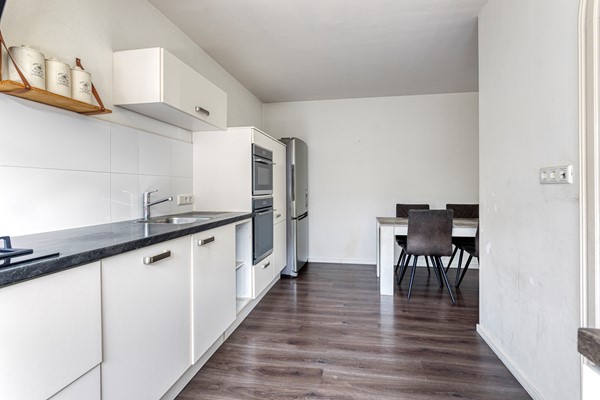 De woonkamer staat in verbinding met de eetkamer en de keuken. In de woonkamer is genoeg ruimte voor een grote zithoek. De keuken heeft een lange wandopstelling met grote lades, diverse bovenkasten en een 5-pits gaskookplaat, afzuigkap, oven, combimagnetron, vaatwasser en een los staande koel-/vriescombinatie.