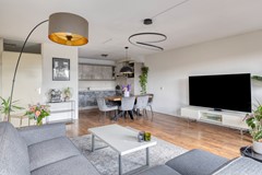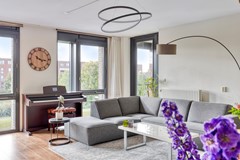 Zeer lichte ruime woon/eetkamer (ca. 33 m²) (voorzien van raampartijen van plafond tot aan vloer) met openslaande deuren naar het ruime zonnige balkon (ca. 9 m²) gelegen op het Zuidoosten.