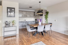 Vanuit de woon/eetkamer bereikt men de L-vormige keuken (ca. 7 m²) voorzien van diverse inbouwapparatuur onder andere; keramische kookplaat, afzuigkap en vaatwasser, onderbouw oven, koelkast. en vriezer en veel bergruimte.
