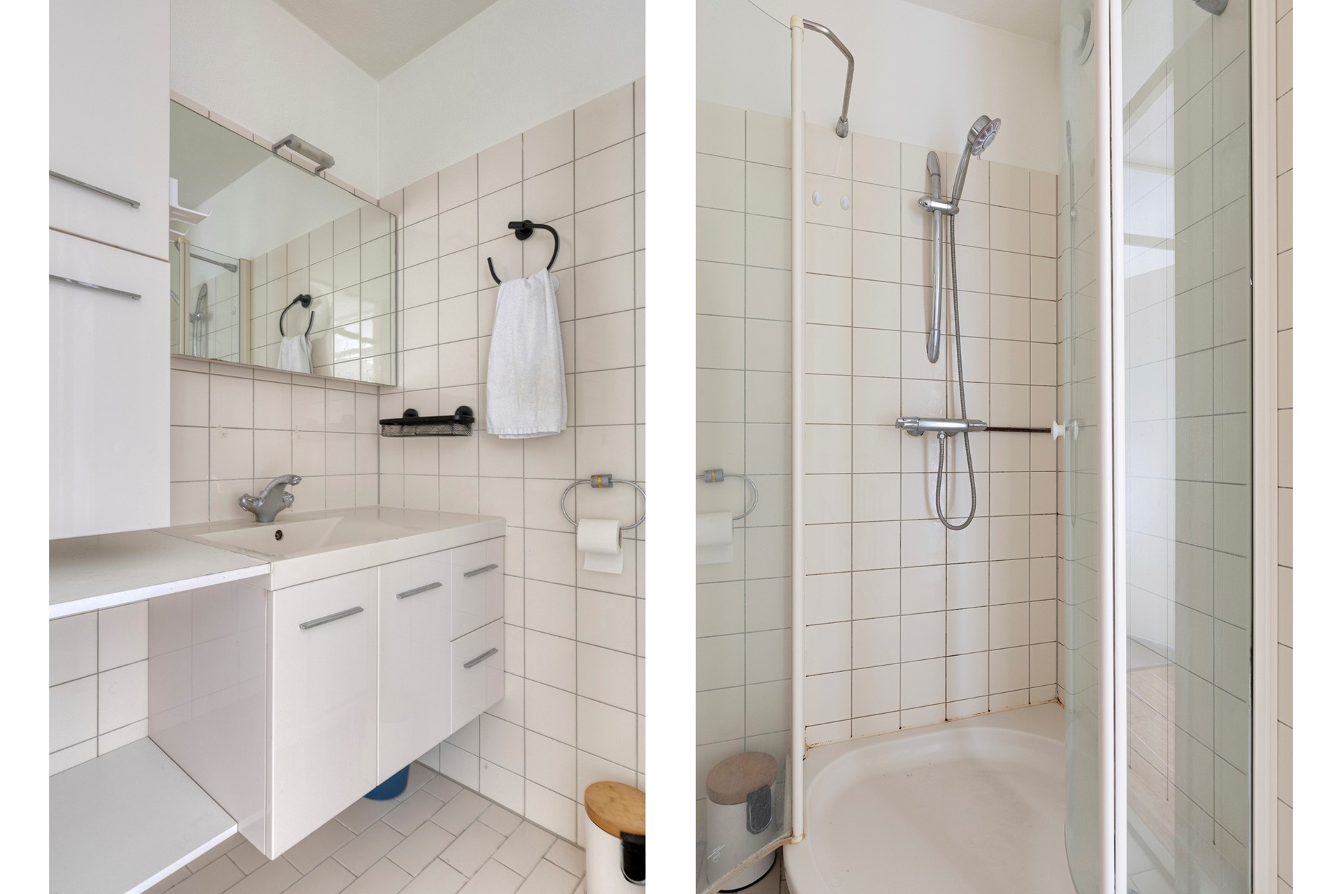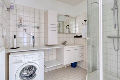 Ruime badkamer (ca. 1.90 x 2.25) met douche, brede wastafel, en met wasmachine/droger aansluiting.
