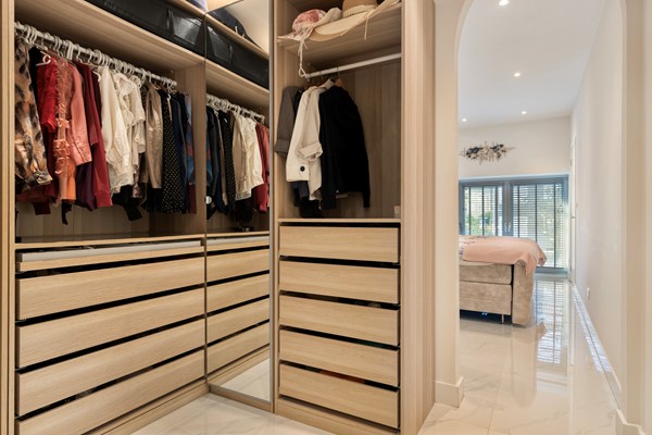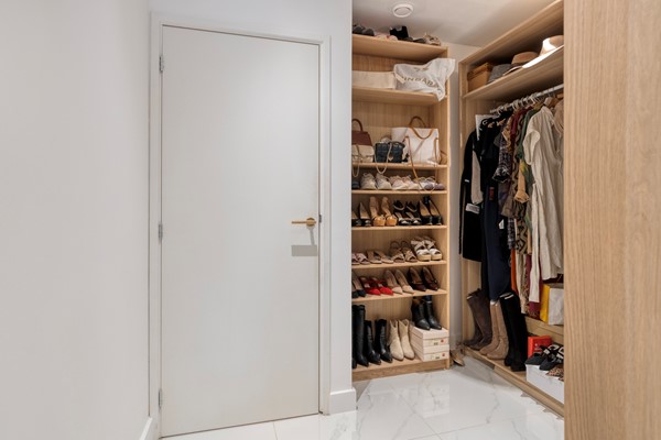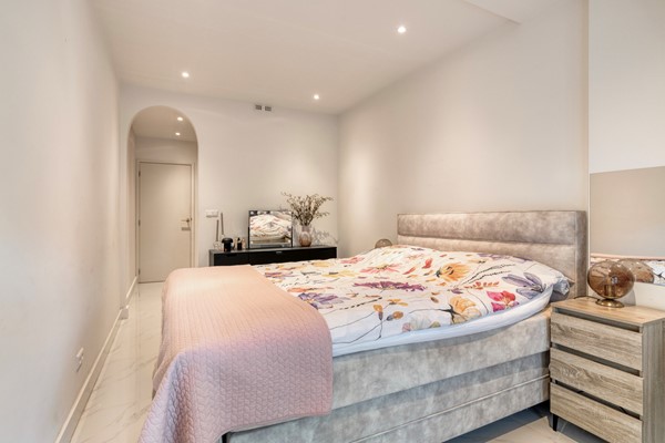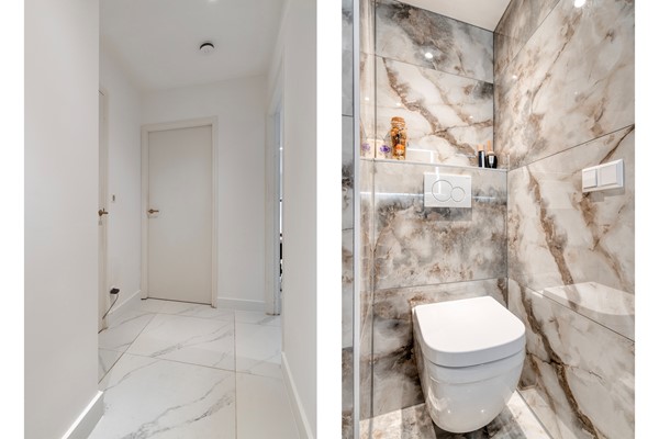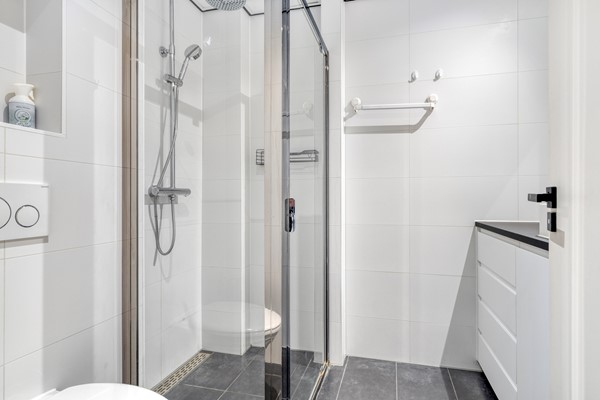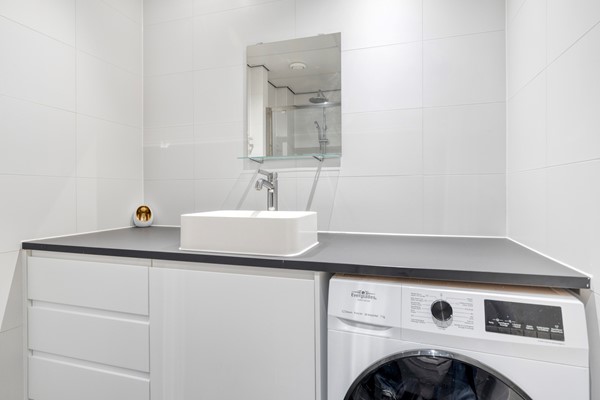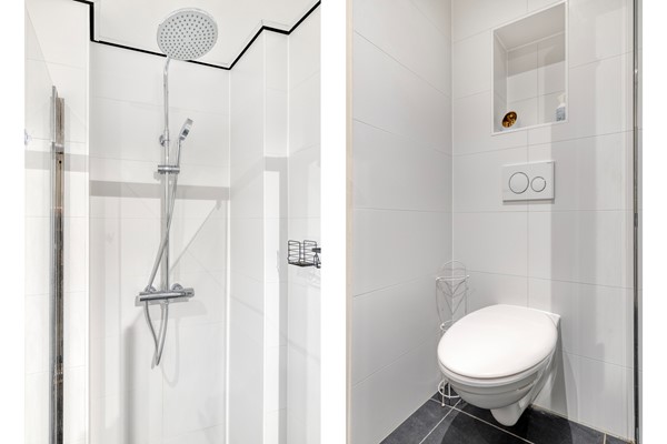 Via het portiek bereikt u de bovenwoning. Hier vindt u een luxe badkamer met inloopdouche, wastafelmeubel en toilet, een praktische berging met cv-ketel en wasmachineaansluiting, en een ruime slaapkamer met handige inloopkast. De