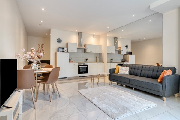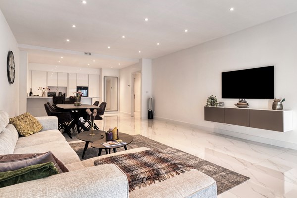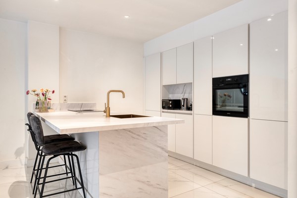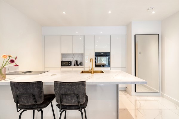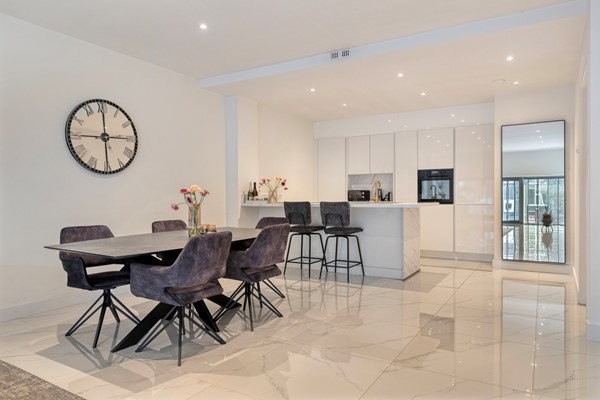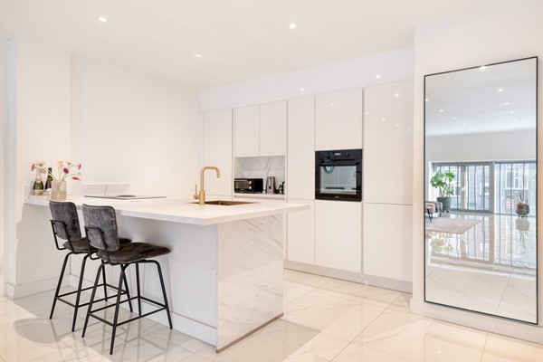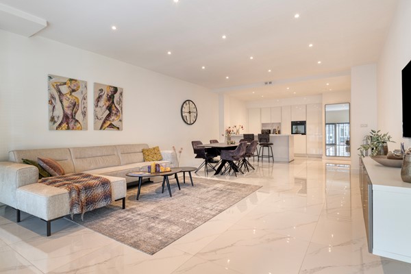 lichte woonkamer grenst aan de moderne open keuken met kook- en spoeleiland en hoogwaardige inbouwapparatuur (koel-vriescombinatie, inductiekookplaat met