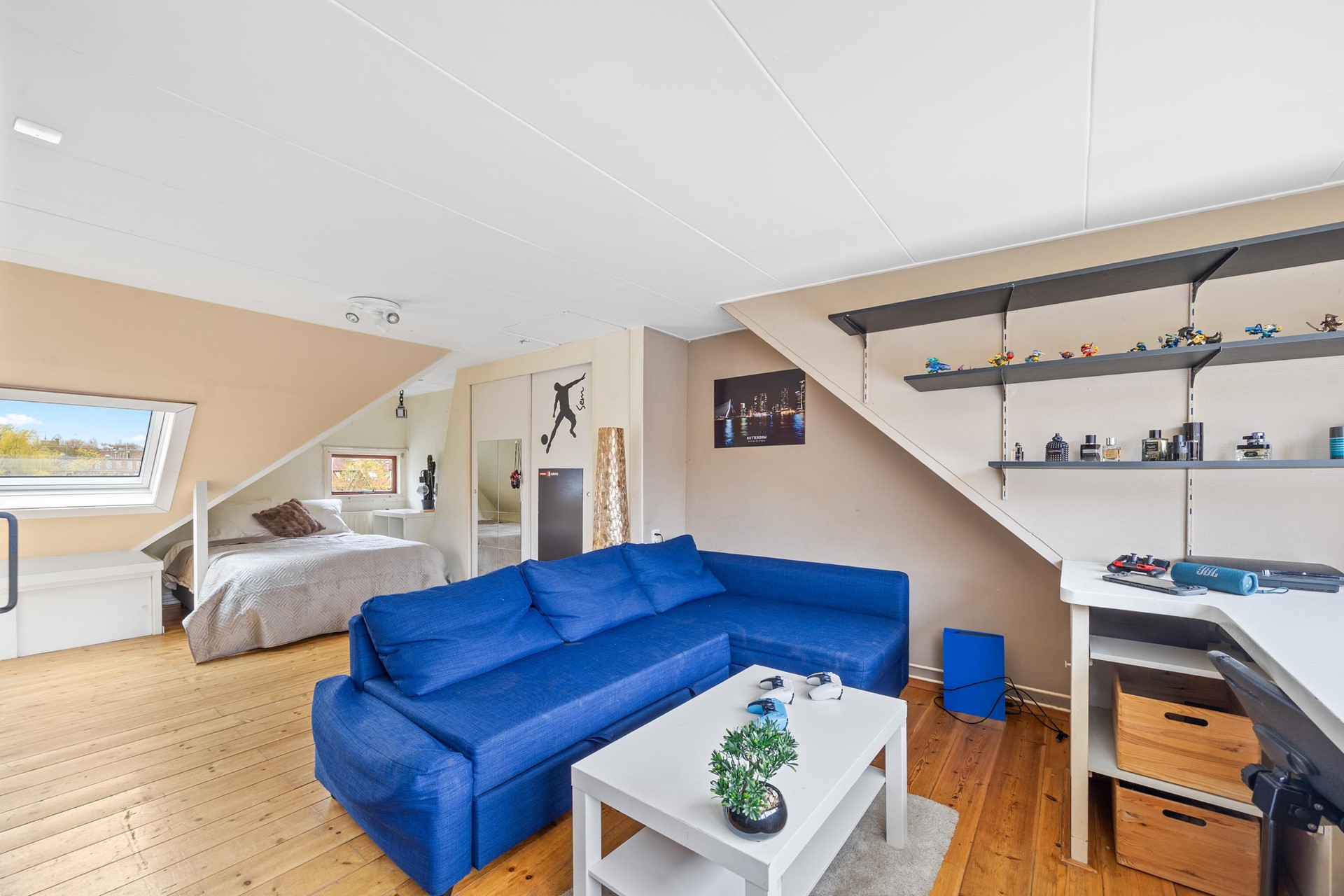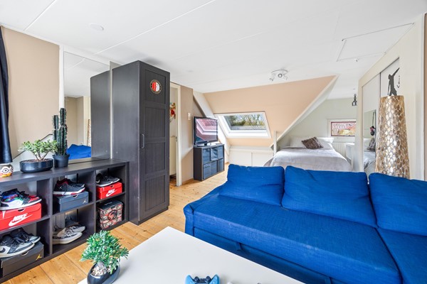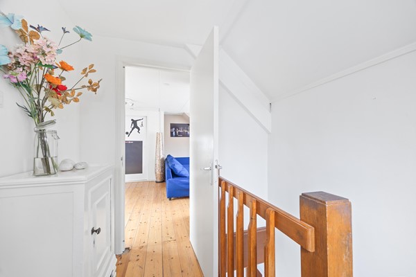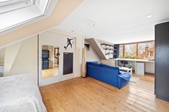 Overloop: zeer ruime 4e slaap/werkkamer met grote dakkapel aan de achterzijde voorzien van een vaste kast, eenvoudig te splitsen in 2 kamers, alsmede een 3e badkamer met douche, wastafel en 3e toilet. Verder bevinden zich in de kamer 2 bergruimtes onder het schuine gedeelte van de kap. Toegang tot een vliering zowel vanuit de overloop als vanuit de kamer.