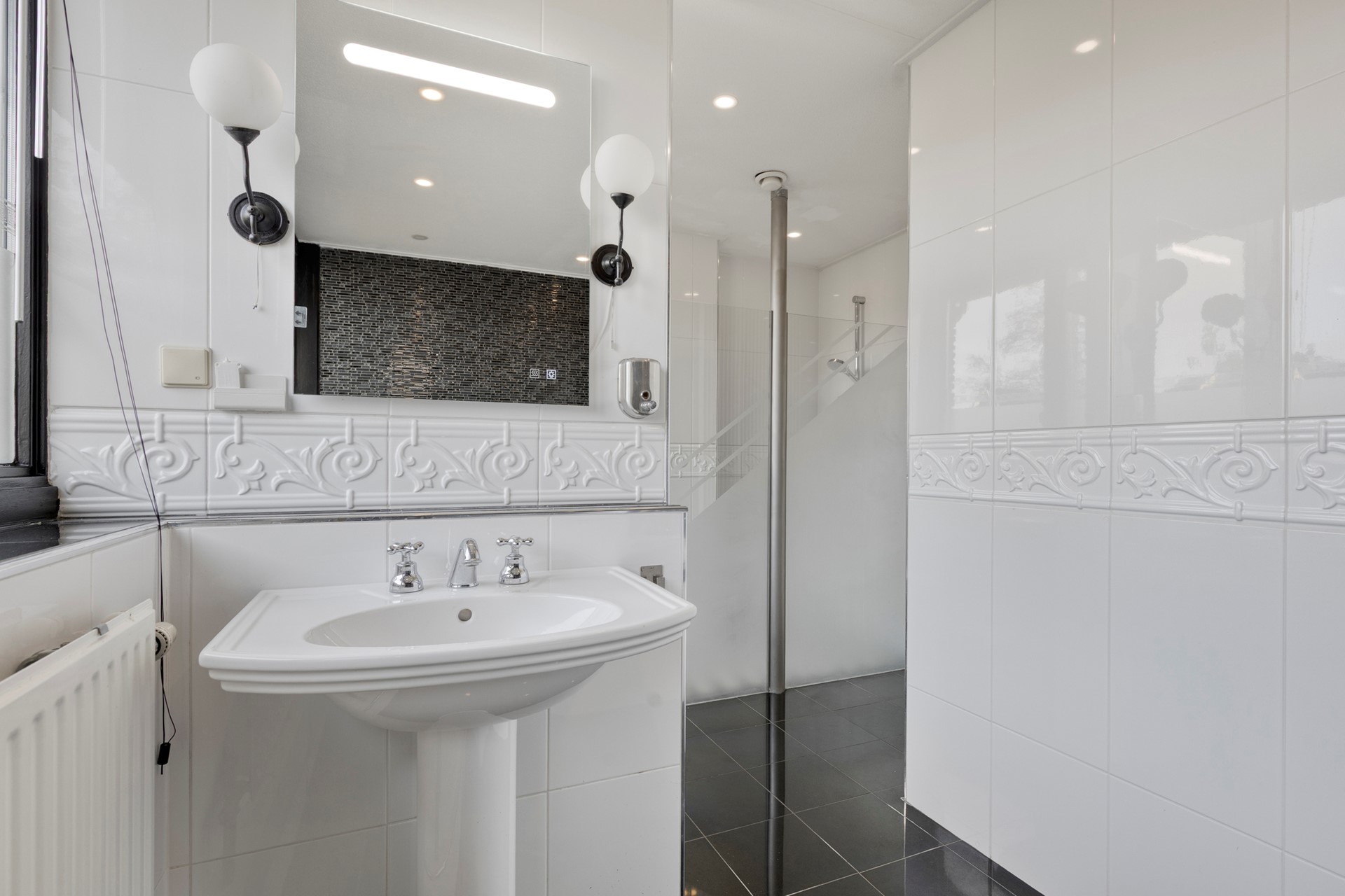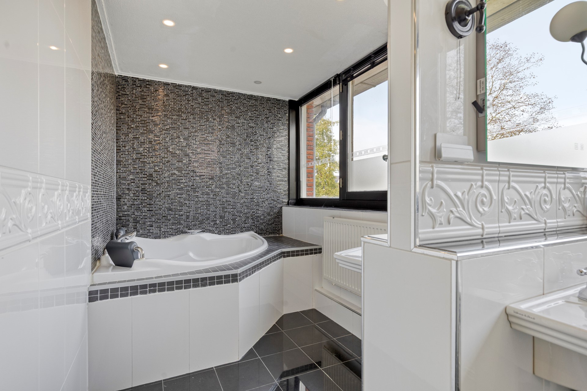 Overloop, voorslaapkamer, zeer ruime master-bedroom, Aan de voorzijde is de uitermate luxe designbadkamer (voorheen badkamer en slaapkamer) voorzien van een royale inloopdouche, hangcloset 2 wastafels (villeroy en boch), designradiator en een exclusieve bubbel/jetstream hoekligbad. De badkamer is afgewerkt met een fraaie zwarte granieten vloer, verlaagd plafond met inbouwspots en muurschildering bij het hoekligbad,